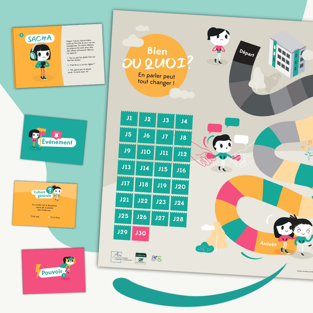 Résultats & impact : "Bien ou Quoi ?" a fourni à l'association ASMA un support de sensibilisation innovant et cohérent pour leurs interventions en milieu scolaire. Le jeu aide à ouvrir le dialogue sur la santé mentale, à équiper les jeunes de ressources précieuses et à contribuer activement à la prévention du suicide et de sa récidive dans la région de Marseille.